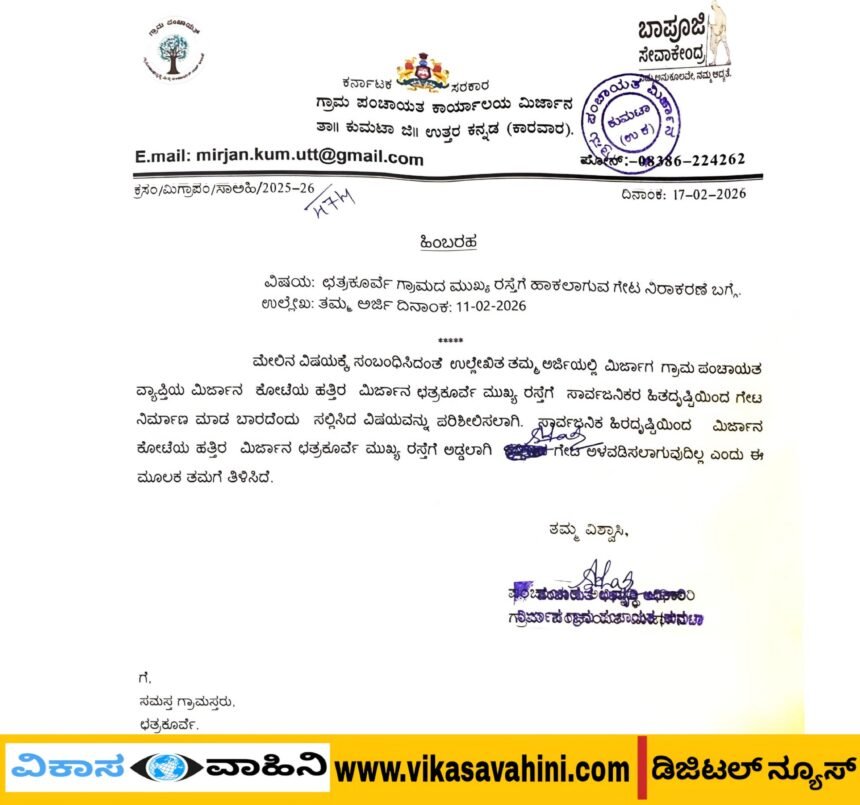 ಕುಮಟಾ: ತಾಲೂಕಿನ ಐತಿಹಾಸಿಕ ಮಿರ್ಜಾನ ಕೋಟೆ ಹಾಗೂ ಛತ್ರಕೂರ್ವೆ ಗ್ರಾಮಕ್ಕೆ ಸಂಪರ್ಕ ಕಲ್ಪಿಸುವ ಪಿ.ಡಬ್ಲ್ಯೂ.ಡಿ ರಸ್ತೆಯಲ್ಲಿ, ಗ್ರಾಮ ಪಂಚಾಯತ್ ವತಿಯಿಂದ ‘ಗೇಟ್’ ಅಳವಡಿಸುತ್ತಿರುವುದನ್ನು ಖಂಡಿಸಿ ಗ್ರಾಮಸ್ಥರು ತೀವ್ರ ಆಕ್ರೋಶ ವ್ಯಕ್ತಪಡಿಸಿದ್ದಾರೆ. "ಈ ರಸ್ತೆ ಛತ್ರಕೂರ್ವೆ ಗ್ರಾಮದ ಜೀವನಾಡಿಯಾಗಿದೆ. ಇಲ್ಲಿ ಗೇಟ್ ಹಾಕಿದರೆ ವಿದ್ಯಾರ್ಥಿಗಳು, ಸಾರ್ವಜನಿಕರು ಹಾಗೂ ತುರ್ತು ವಾಹನಗಳ ಮುಕ್ತ ಸಂಚಾರಕ್ಕೆ ಅಡಚಣೆಯಾಗುತ್ತದೆ," ಎಂದು ಆರೋಪಿಸಿ ಗ್ರಾಮದ 50ಕ್ಕೂ ಹೆಚ್ಚು ಮಂದಿ ಪಿಡಿಒಗೆ ಮನವಿ ಸಲ್ಲಿಸಿದರು. ಗ್ರಾಮದ ಮುಖಂಡ ವಿನಾಯಕ ಪಟಗಾರ ಮಾತನಾಡಿ, "ಸಾರ್ವಜನಿಕ ರಸ್ತೆಯನ್ನು ಬಂದ್ ಮಾಡಿ ಗೇಟ್ ಅಳವಡಿಸುವುದು ಸರಿಯಲ್ಲ, ಕೂಡಲೇ…