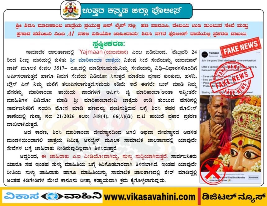 ನಾಡಿನ ಪ್ರಸಿದ್ಧ ಶಿರಸಿ ಶ್ರೀ ಮಾರಿಕಾಂಬಾ ಜಾತ್ರೆಯ ಸಂಭ್ರಮದ ನಡುವೆಯೇ, ಭಕ್ತರ ಭಕ್ತಿ ಹಾಗೂ ನಂಬಿಕೆಯನ್ನು ಬಂಡವಾಳ ವಾಗಿಸಿಕೊಂಡು ವಂಚಿಸಲು ಸೈಬರ್ ಖದೀಮರು ಹೊಸ ತಂತ್ರ ರೂಪಿಸಿದ್ದಾರೆ. ಕೃತಕ ಬುದ್ಧಿಮತ್ತೆ (AI) ತಂತ್ರಜ್ಞಾನ ಬಳಸಿ ನಕಲಿ ವಿಡಿಯೋ ಸೃಷ್ಟಿಸಿರುವ ವಂಚಕರು, ಆನ್ಲೈನ್ ಮೂಲಕ ದೇವಿಯ 'ಉಡಿ ತುಂಬುವ ಸೇವೆ' ಮಾಡಿಸುವುದಾಗಿ ನಂಬಿಸಿ ಹಣ ದೋಚಲು ಯತ್ನಿಸಿದ್ದು, ಈ ಬಗ್ಗೆ ಶಿರಸಿ ಶಹರ ಪೊಲೀಸ್ ಠಾಣೆಯಲ್ಲಿ ಪ್ರಕರಣ ದಾಖಲಾಗಿದೆ. ಏನಿದು ವಂಚನೆ ಜಾಲ? ಸಾಮಾಜಿಕ ಜಾಲತಾಣಗಳಲ್ಲಿ "Yajmaan" (ಯಜಮಾನ) ಎಂಬ ಖಾತೆಯಿಂದ ಈ ನಕಲಿ ವಿಡಿಯೋ…