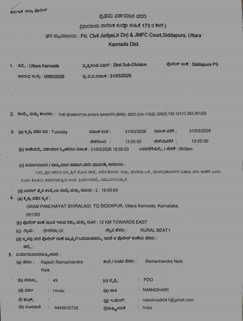 ಪ್ರಕರಣ ದಾಖಲು: ಹಲ್ಲೆಗೊಳಗಾದ ಪಿಡಿಒ ರಾಜೇಶ ನಾಯ್ಕ ಅವರು ಸಿದ್ದಾಪುರ ಸರ್ಕಾರಿ ಆಸ್ಪತ್ರೆಯಲ್ಲಿ ಚಿಕಿತ್ಸೆ ಪಡೆದುಕೊಂಡು, ಮೇಲಾಧಿಕಾರಿಗಳಿಗೆ ವಿಷಯ ತಿಳಿಸಿದ ಬಳಿಕ ಸಿದ್ದಾಪುರ ಪೊಲೀಸ್ ಠಾಣೆಗೆ ತೆರಳಿ ದೂರು ನೀಡಿದ್ದಾರೆ. ಆಪಾದಿತನ ವಿರುದ್ಧ ಭಾರತೀಯ ನ್ಯಾಯ ಸಂಹಿತೆ (BNS) 2023 ರ ಕಲಂ 115(2), 126(2), 132, 121(1), 352, ಮತ್ತು 351(2) ಅಡಿಯಲ್ಲಿ ಪ್ರಥಮ ವರ್ತಮಾನ ವರದಿ (FIR No: 0080/2026) ದಾಖಲಾಗಿದೆ.