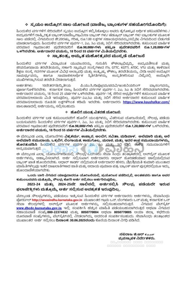 ಪ್ರವರ್ಗ 1, 2ಎ, 3ಎ ಮತ್ತು 3ಬಿಗೆ ಸೇರಿದ ಅಭ್ಯರ್ಥಿಗಳು ಈ ಯೋಜನೆಗಳಿಗೆ ಅರ್ಹರು. ಸೇವಾ ಸಿಂಧು ಪೋರ್ಟಲ್ ಮೂಲಕ ಅರ್ಜಿ ಸಲ್ಲಿಸಲು ಜೂನ್ 30, 2025 ಕೊನೆಯ ದಿನಾಂಕವಾಗಿದ್ದು, ವಿವರಗಳಿಗೆ www.dbcdc.karnataka.gov.in ವೆಬ್ಸೈಟ್ ಅಥವಾ ಸಹಾಯವಾಣಿ ಸಂಖ್ಯೆ 080-22374832, 8050770004/5 ಅನ್ನು ಸಂಪರ್ಕಿಸಬಹುದು.