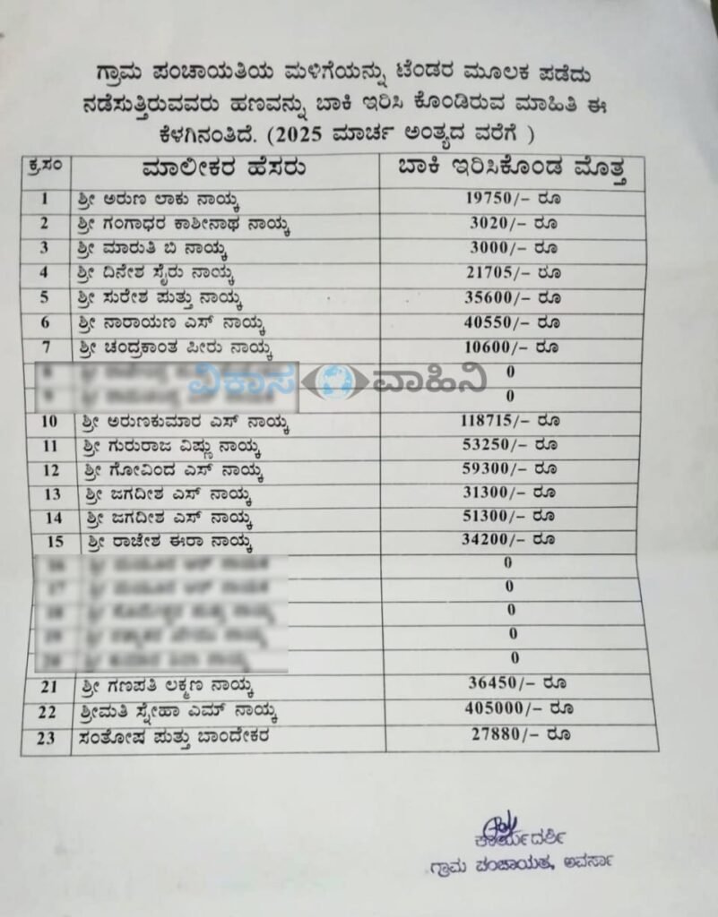 ಅಂಕೋಲಾ, (ಮೇ 8 2025): ಅಂಕೋಲಾ ತಾಲೂಕಿನ ಅವರ್ಸ ಗ್ರಾಮ ಪಂಚಾಯತ ವ್ಯಾಪ್ತಿಯ 23 ವ್ಯಾಪಾರ ಮಳಿಗೆಗಳ ಪೈಕಿ 16 ವ್ಯಾಪಾರ ಮಳಿಗೆಗಳಿಂದ ಬರೋಬ್ಬರಿ 9,15,620 ರೂಪಾಯಿ ಬಾಕಿ ಉಳಿದಿರುವ ಘಟನೆ ಸಂಬಂಧಿಸಿದ ದಾಖಲೆಗಳೊಂದಿಗೆ ಬೆಳಕಿಗೆ ಬಂದಿದ್ದು, ಗ್ರಾಮ ಪಂಚಾಯತಿ ಹಾಗೂ ಅಭಿವೃದ್ಧಿ ಅಧಿಕಾರಿಗಳ ನಿರ್ಲಕ್ಷ್ಯ ಪರೋಕ್ಷವಾಗಿ ಬಹಿರಂಗವಾಗಿದೆ.