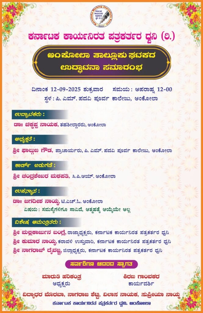 ಅಂಕೋಲಾದಲ್ಲಿ ಪತ್ರಕರ್ತರ ಧ್ವನಿ ಸಂಘಟನೆಯ ಉದ್ಘಾಟನೆ – ಮಾನಸಿಕ ಆರೋಗ್ಯದ ಸದೃಢತೆ ಕುರಿತು ಜಾಗೃತಿ ಕಾರ್ಯಕ್ರಮ ಸೆ.12ರಂದು..