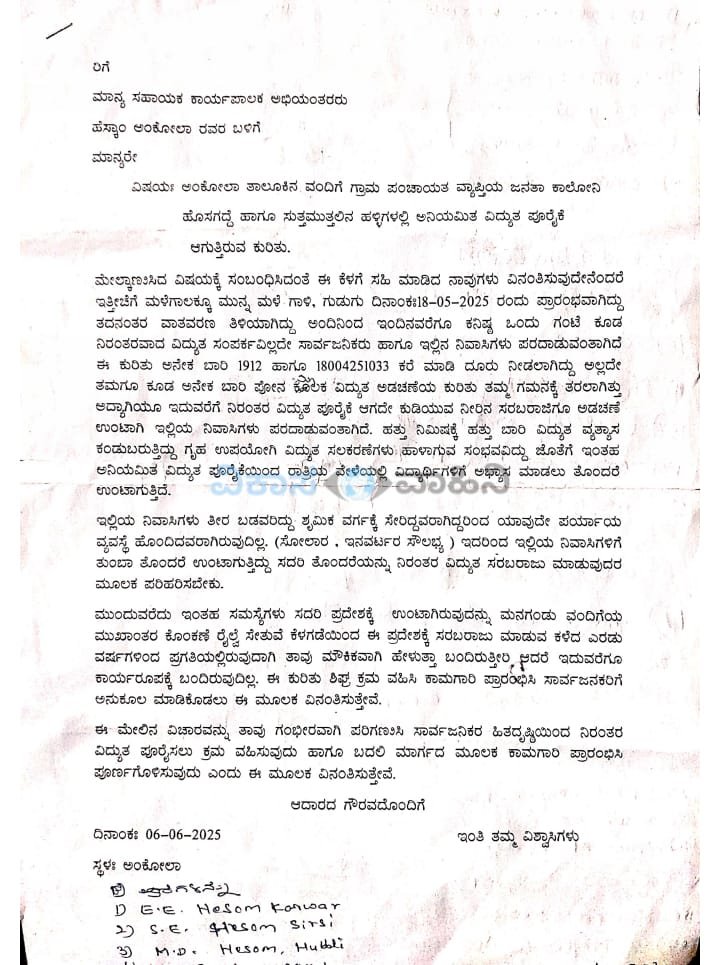 ಅಂಕೋಲಾ: ಅಂಕೋಲಾ ತಾಲೂಕಿನ ವಂದಿಗೆ ಗ್ರಾಮ ಪಂಚಾಯತ್ ವ್ಯಾಪ್ತಿಯ ಜನತಾ ಕಾಲೋನಿ ಪ್ರದೇಶದಲ್ಲಿ ಕಳೆದ ಕೆಲವು ದಿನಗಳಿಂದ ನಿರಂತರವಾಗಿ ವಿದ್ಯುತ್ ಕಡಿತವಾಗುತ್ತಿದ್ದು, ಇದರಿಂದ ಸಾರ್ವಜನಿಕರು ತೀವ್ರ ತೊಂದರೆ ಅನುಭವಿಸುತ್ತಿದ್ದಾರೆ. ಈ ಹಿನ್ನೆಲೆಯಲ್ಲಿ ಕಾಲೋನಿಯ ನಿವಾಸಿಗಳು ಹೆಸ್ಕಾಂ (HESCOM) ಸಹಾಯಕ ಕಾರ್ಯನಿರ್ವಾಹಕ ಎಂಜಿನಿಯರ್ ಅವರಿಗೆ ಮನವಿ ಸಲ್ಲಿಸಿ, ಕೂಡಲೇ ಸೂಕ್ತ ಕ್ರಮ ಕೈಗೊಳ್ಳುವಂತೆ ಒತ್ತಾಯಿಸಿದ್ದಾರೆ.