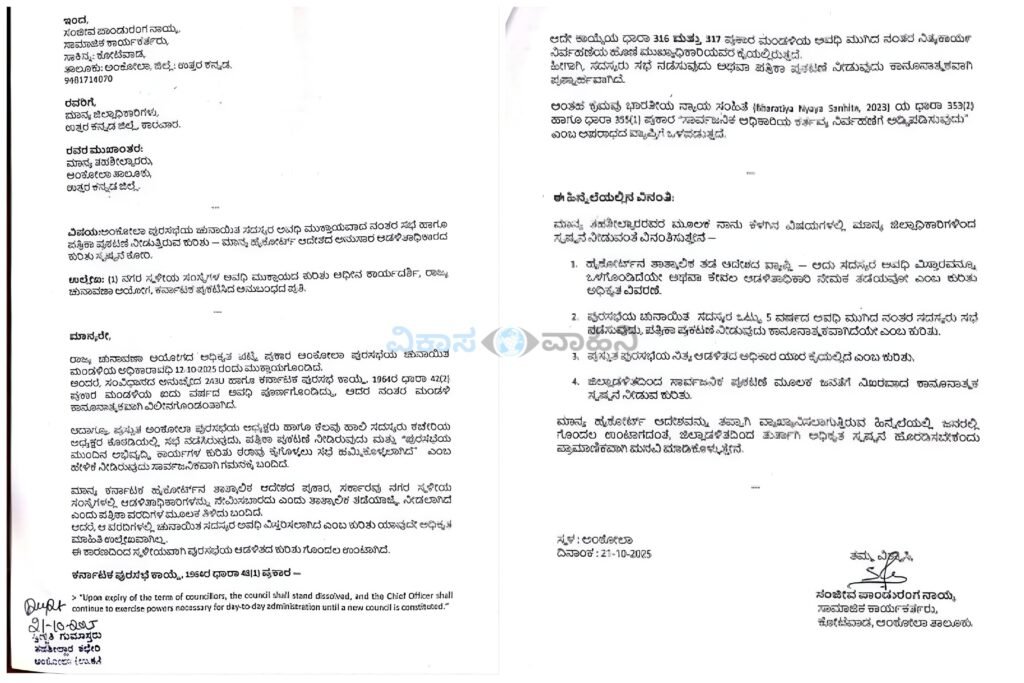ಅವರು ತಮ್ಮ ಮನವಿಯಲ್ಲಿ ಕರ್ನಾಟಕ ಪುರಸಭೆ ಕಾಯ್ದೆ, 1964ರ ಧಾರಾ 48(1) ಮತ್ತು ಭಾರತೀಯ ನ್ಯಾಯ ಸಂಹಿತೆ (BNS), 2023ರ ಧಾರಾ 353(2) ಹಾಗೂ 355(1) ಉಲ್ಲೇಖಿಸಿ