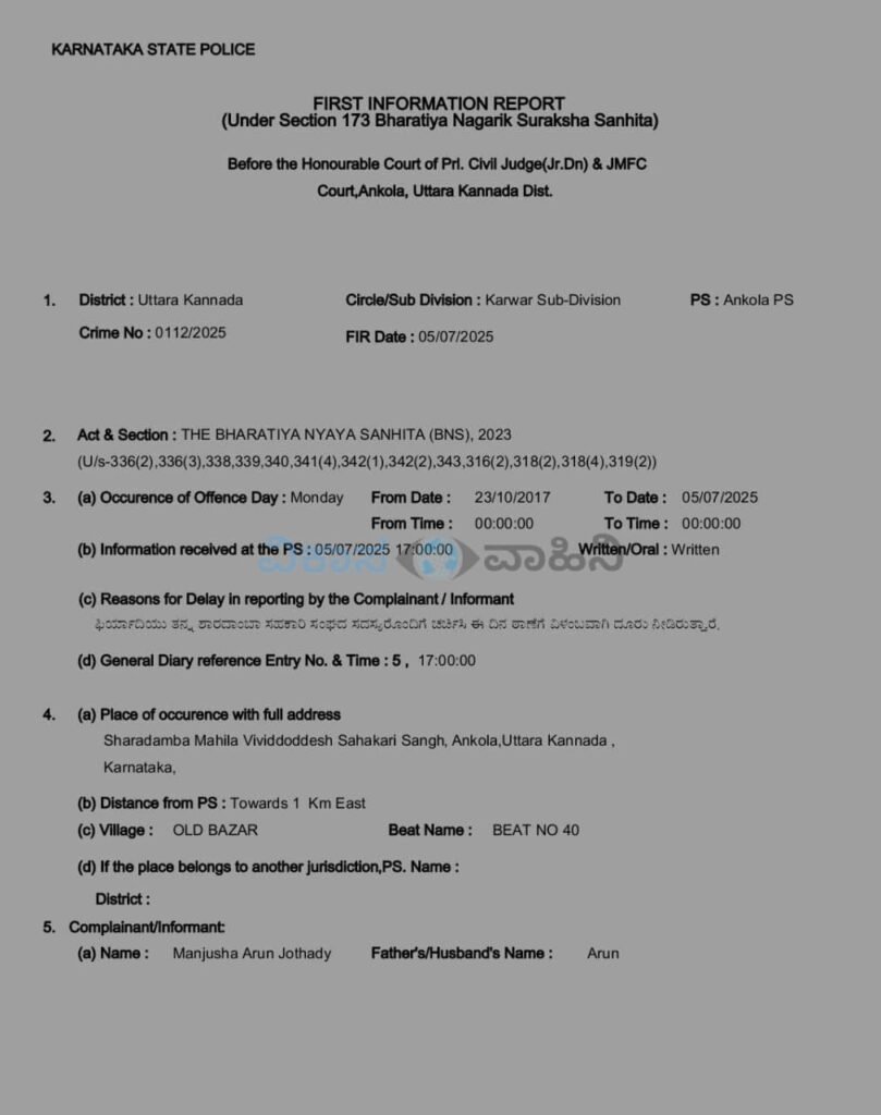 ಅಂಕೋಲಾ ಪಟ್ಟಣದ ಶಾರದಾಂಬಾ ಮಹಿಳಾ ವಿವಿಧೋದ್ದೇಶ ಸಹಕಾರ ಸಂಘದಲ್ಲಿ ಸಂಭವಿಸಿರುವ ರೂ. 10 ಲಕ್ಷದ ಸಾಲ ವ್ಯವಹಾರಕ್ಕೆ ಸಂಬಂಧಿಸಿದ ಭಾರಿ ಹಣಕಾಸು ವಂಚನೆ ಪ್ರಕರಣ ಇದೀಗ ತೀವ್ರ ಚರ್ಚೆಗೆ ಕಾರಣವಾಗಿದೆ. ಸಂಘದ ಸಿಬ್ಬಂದಿ ಮಂಜುಷಾ ಅರುಣ್ ಜೋಥಾಡಿ ನೀಡಿದ ದೂರಿನ ಆಧಾರದ ಮೇಲೆ ಅಂಕೋಲಾ ಪೊಲೀಸ್ ಠಾಣೆಯಲ್ಲಿ ದಾಖಲಾಗಿರುವ FIR ಪ್ರಕಾರ, ಈ ಪ್ರಕರಣದಲ್ಲಿ ಪ್ರಮುಖ ಆರೋಪಿ ರಾಘು ಅಶೋಕ್ ನಾಯ್ಕ್ ಸೇರಿ ಒಟ್ಟು ಏಳು ಮಂದಿಯ ವಿರುದ್ಧ ನಾನಾ ಗಂಭೀರ ಆರೋಪಗಳು ಕೇಳಿಬಂದಿವೆ.