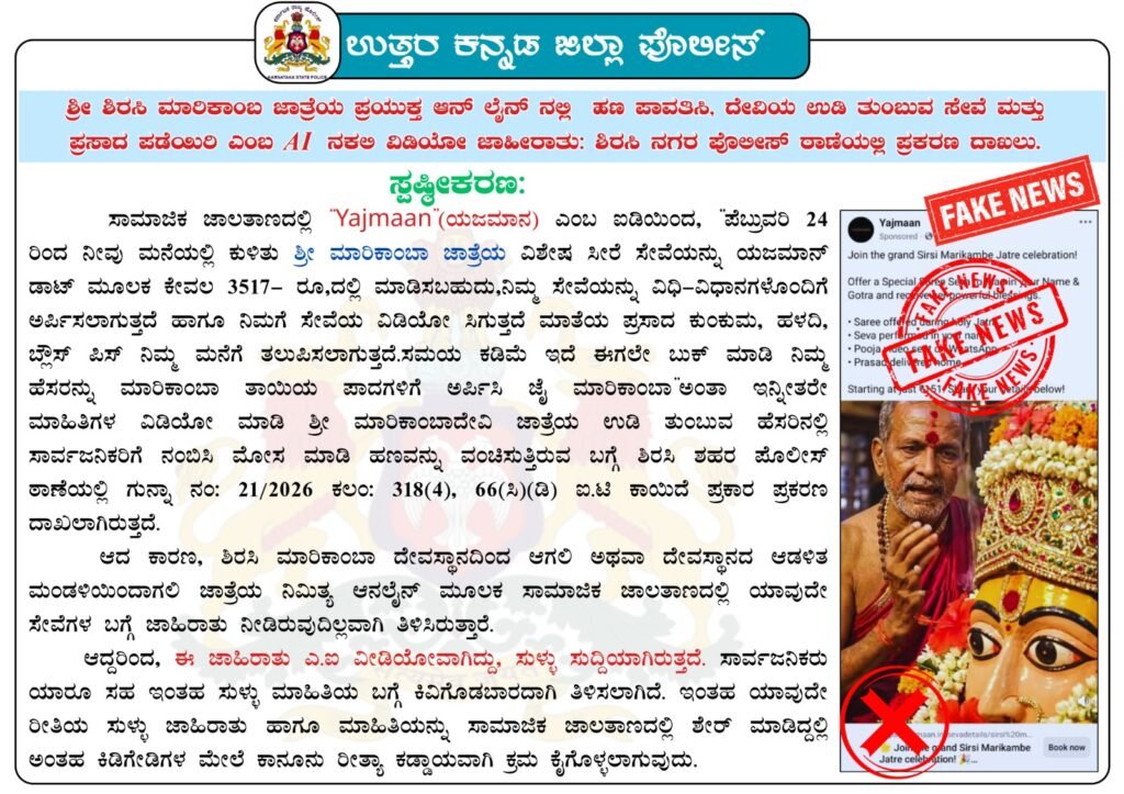 ಪೊಲೀಸರ ಖಡಕ್ ಎಚ್ಚರಿಕೆ: ಇದೊಂದು ಸಂಪೂರ್ಣ AI ನಿರ್ಮಿತ ನಕಲಿ ವಿಡಿಯೋ ಆಗಿದ್ದು, ಸಾರ್ವಜನಿಕರು ಹಾಗೂ ಭಕ್ತರು ಇಂತಹ ಸುಳ್ಳು ಮಾಹಿತಿಗೆ ಕಿವಿಗೊಡಬಾರದು, ಯಾವುದೇ ಲಿಂಕ್ ಕ್ಲಿಕ್ ಮಾಡಿ ಹಣ ಪಾವತಿಸಬಾರದು ಎಂದು ಉತ್ತರ ಕನ್ನಡ ಜಿಲ್ಲಾ ಪೊಲೀಸ್ ಇಲಾಖೆ ತಿಳಿಸಿದೆ. ಜೊತೆಗೆ, ಇಂತಹ ನಕಲಿ ಜಾಹೀರಾತುಗಳನ್ನು ಸಾಮಾಜಿಕ ಜಾಲತಾಣಗಳಲ್ಲಿ ಶೇರ್ ಮಾಡುವ ಕಿಡಿಗೇಡಿಗಳ ವಿರುದ್ಧವೂ ಮುಲಾಜಿಲ್ಲದೆ ಕಠಿಣ ಕಾನೂನು ಕ್ರಮ ಜರುಗಿಸಲಾಗುವುದು ಎಂದು ಎಚ್ಚರಿಕೆ ನೀಡಲಾಗಿದೆ.